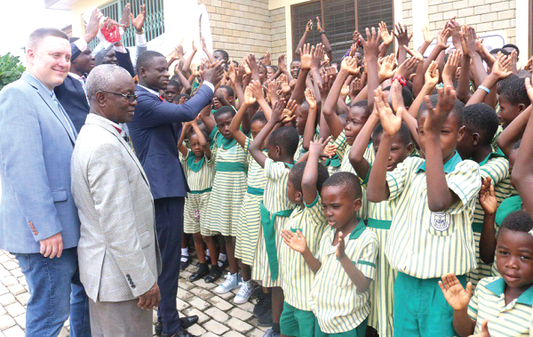 Pupils of the school, cheerfully welcoming Mr Rutland (left) on his arrival for the handing over of the two facilities. Those with them are Reverend Odarno (2nd left), and some teachers of the school