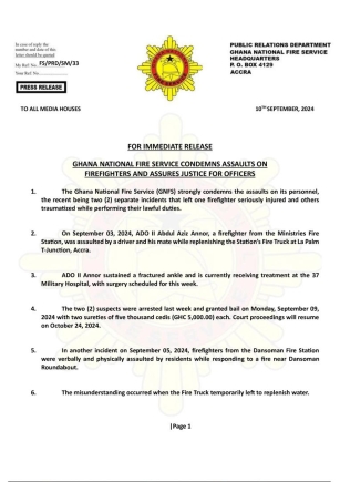 In a statement issued on September 10, 2024, by the Head of Public Relations, Divisional Officer (DO) II Desmond E. Ackah, he revealed that two separate incidents had occurred, leaving one firefighter seriously injured and another traumatised while on duty.