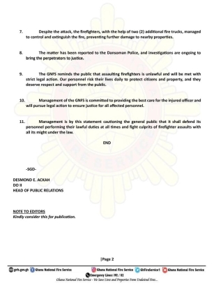In the second incident, he explained that firefighters from the Dansoman Fire Station were verbally and physically attacked by residents last Thursday while attending to a fire near the Dansoman roundabout.