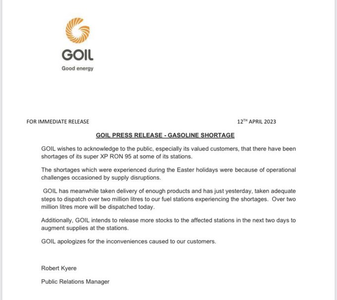 In a statement, GOIL apologized for the inconvenience caused and said that over two million litres of fuel have been dispatched to stations experiencing the shortages, with over one million litres due to be dispatched today.