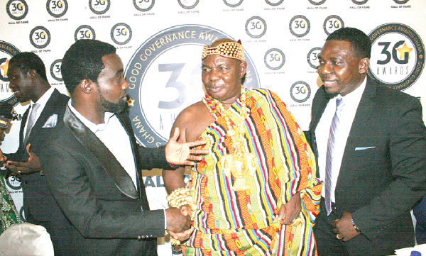 Odeefoo Oteng Korankye II (middle), Berekusuhene, who is also the Akwapem Twafohene interacting with Mr Prince Mackay (left) CEO of Good Governance Hall of Fame and awards, and Mr Felix Kwesi Andam (right), Member of the Good Governance Hall of Fame and awards