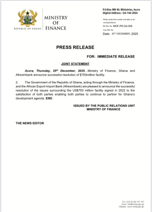 The Ministry of Finance described the resolution as an important step as Ghana works to rebuild external confidence, and said the relationship with Afreximbank remains strategic.