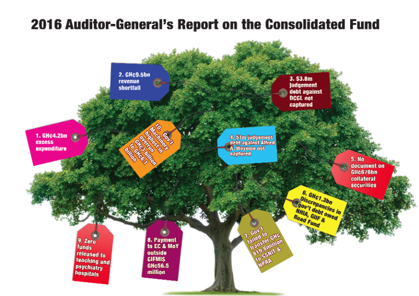 The Auditor-General’s review of the 2016 financial statements also showed that four ministries, departments and agencies (MDAs) — the Ghana Education Service (GES), the Ghana Health Service (GHS), the Ministry of Finance and the Office of Government Machinery (General Government Services) — exceeded their budget allocations by GH¢5,206,284,575.
