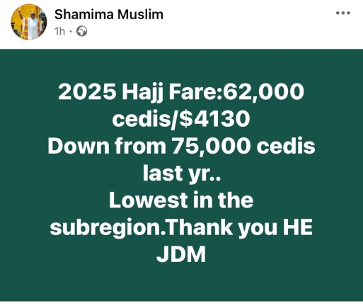 The Deputy Presidential Spokesperson, Shamima Muslim, has announced that the 2025 Hajj fare has been set at GH₵62,000 (approximately $4,130).