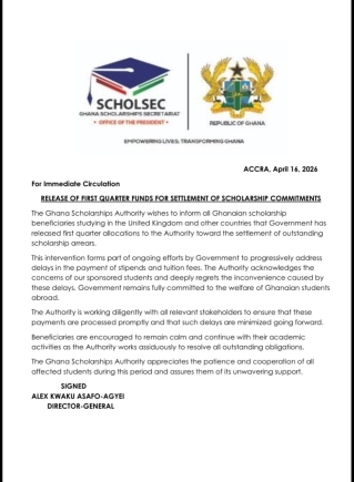 The Ghana Scholarships Authority has announced the release of first quarter government allocations aimed at settling outstanding scholarship arrears for Ghanaian students studying in the United Kingdom and other countries.
