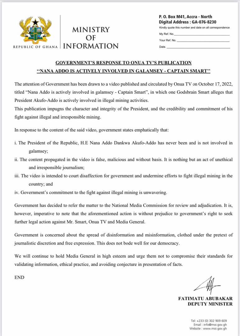 In a statement signed by the Deputy Minister of Information, Fatimatu Abubakar, the government said the "unethical" publication by broadcaster Godsbrain Smart today (October 17, 2022) was meant to impugn "the character and integrity of the President, and the credibility and commitment of his fight against illegal and irresponsible mining".