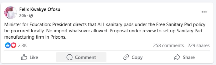 In a Facebook post, the Minister of State for Government Communications, Felix Kwakye Ofosu, disclosed that President John Dramani Mahama has issued a directive mandating that all sanitary pads distributed under the policy must be sourced locally, with no imports allowed.