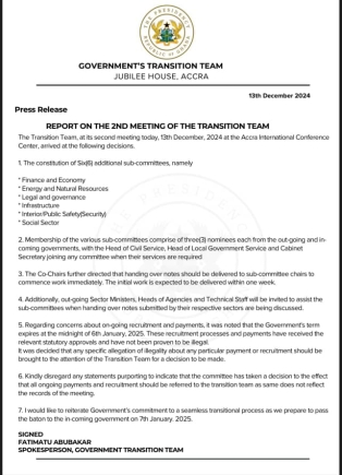 During its second meeting on December 13, 2024, held at the Accra International Conference Centre, the Transition Team clarified its position, emphasizing that only specific allegations of illegality regarding payments or recruitment would be reviewed by the Transition Committee.