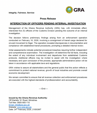 The Ghana Revenue Authority has interdicted five officers from its Customs Division following what it described as discrepancies uncovered during an enforcement operation involving transit cargo bound for Niger.