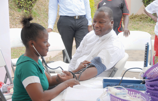 Lawyer Philip Addison (right), NPP parliamentary aspirant for the Klottey-Korle Constituency, checking his blood pressure (BP) before donating blood during the blood donation exercise