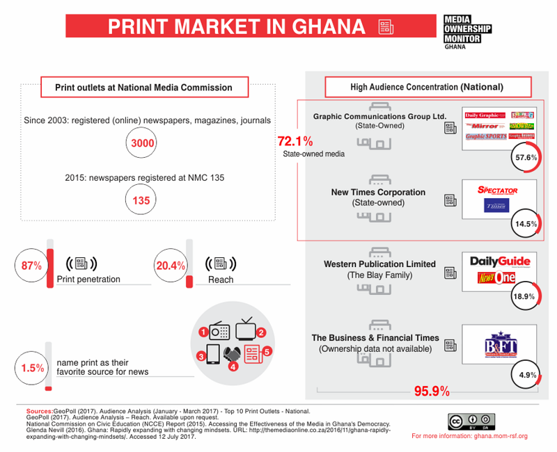 The New Times Corporation (14.5%) publishers of the Ghanaian Times and The Spectator ranked third while Business and Financial Times placed fourth with 4.9% of the market share.