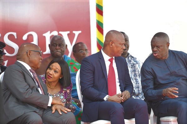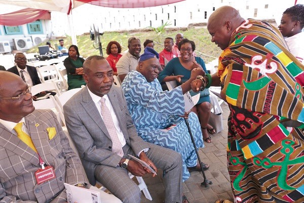 Mrs Jean Mensa (squatting), the Chairperson of the Electoral Commission, interacting with Professor Aaron Mike Oquaye at the event. With them are Mr Ato Afful (2nd right), Managing Director of the GCGL, and Dr Ibrahim Mohammed Awal (right), the Minister of Business Development