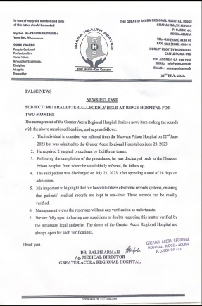 The management of the Greater Accra Regional Hospital has refuted claims that the facility harboured a fraudster who was supposed to be serving a 15-year jail term, stating that the individual was only admitted for medical treatment.
