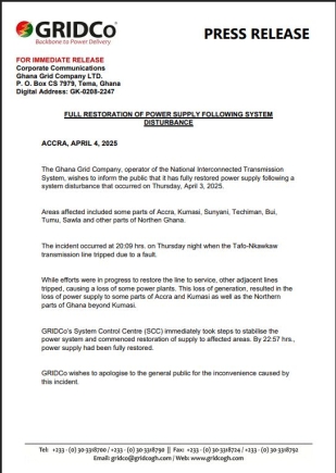 The Ghana Grid Company (GRIDCo) has announced the full restoration of electricity supply following a system disturbance that occurred on the evening of Thursday, April 3, 2025.