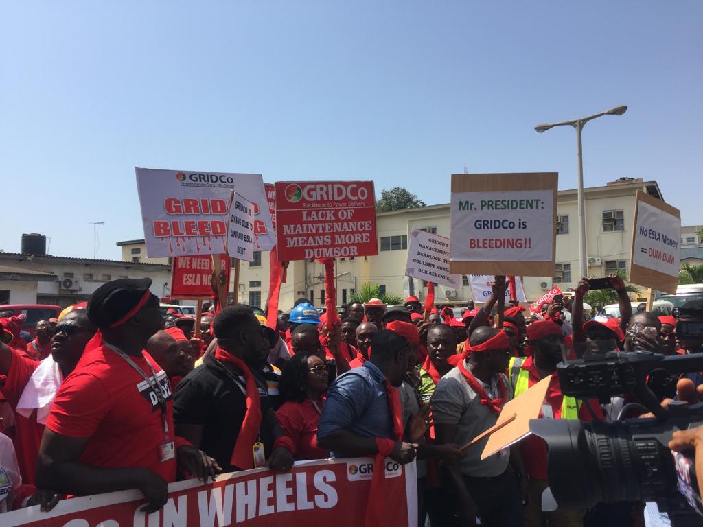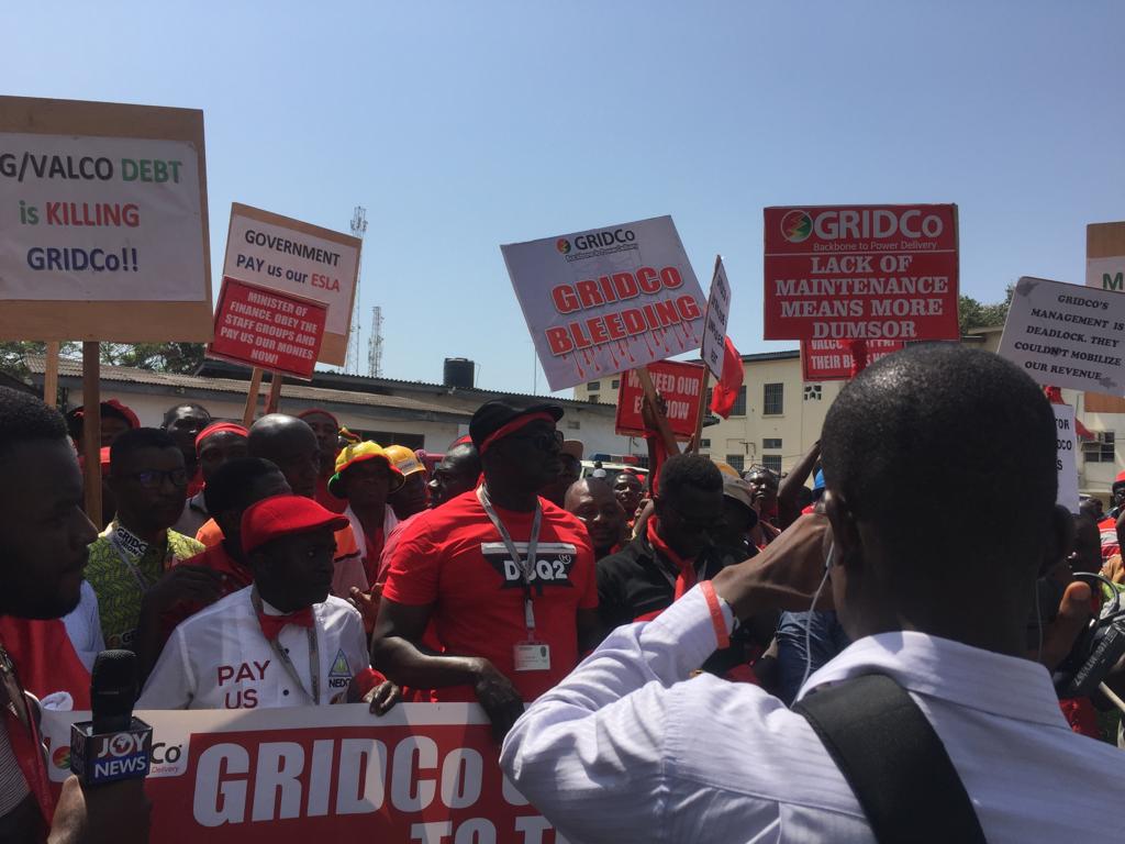 Workers of the Ghana Grid Company (GRIDCo) hit the streets Tuesday to protest huge debts owed the company by ECG, VALCO, PDS and NEDCO.
