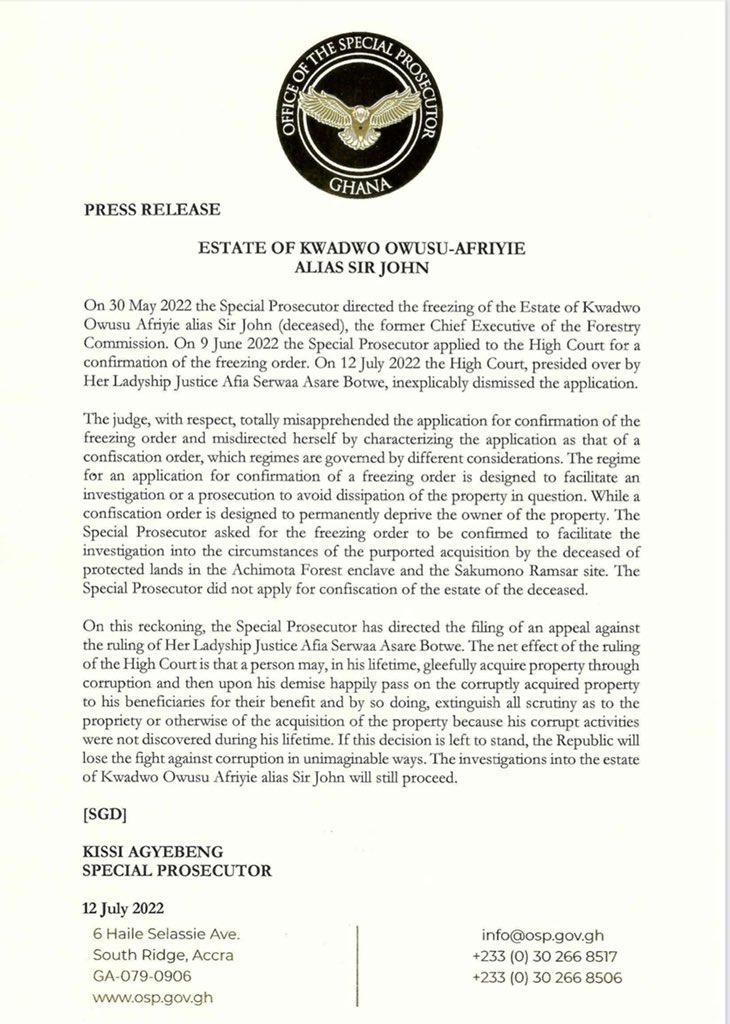 On 30 May 2022 the Special Prosecutor directed the freezing of the Estate of Kwadwo Owusu Afrivie alias Sir John (deceased), the former Chief Executive of the Forestry Commission.