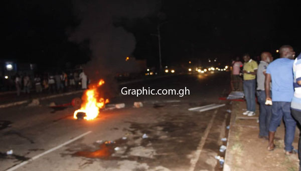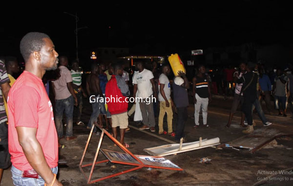 The incident angered the youth, who blocked the highway for about an hour and a half with mini-billboards, stones, big yellow gallons, popularly referred to as 'Kufuor gallon', wooden boards and stones.