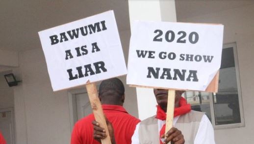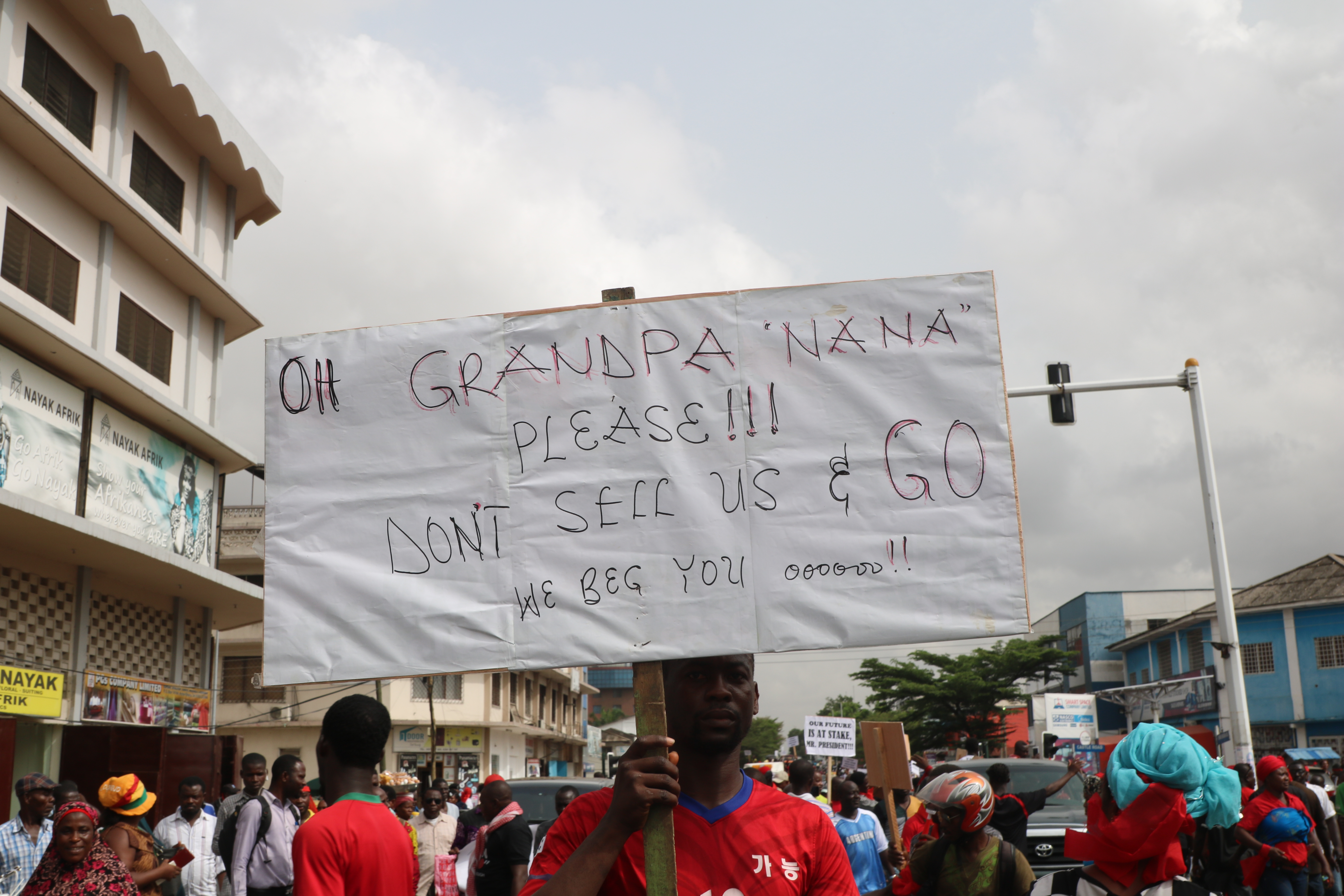 "Akufo Addo return the US$ 20 million", "Oh grandpa "Nana" please!! don't sell us & go, we beg you ooooo!!", "Our future is at stake, Mr President", were some of the interesting inscriptions on the placard the demonstrators carried.