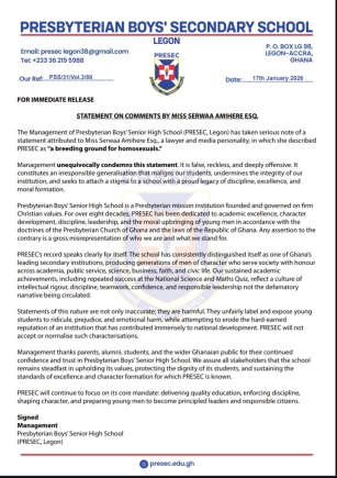 PRESEC’s management positioned its rebuttal within this sensitive climate, stating such “harmful” comments unfairly “expose young students to ridicule, prejudice, and emotional harm” while damaging the institution’s reputation. “PRESEC will not accept or normalise such characterisations,” the statement firmly concluded.