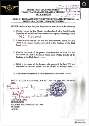 A document circulating online, said to be the result of a search at the High Court (Probate and Administration Division), suggests that the late Ghanaian highlife icon, Charles Kwadwo Fosu (popularly known as Daddy Lumba), did not deposit a will.