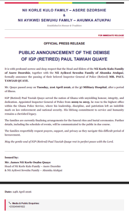 The Nii Korle Kulo Family of Asere Dzorshie and the Nii Ayikwei Sewuhu Family of Ahumka Atukpai have announced the passing of retired Inspector General of Police, Mr Paul Tawiah Quaye, who died on Tuesday, April 21, 2026, at the 37 Military Hospital following a period of illness.