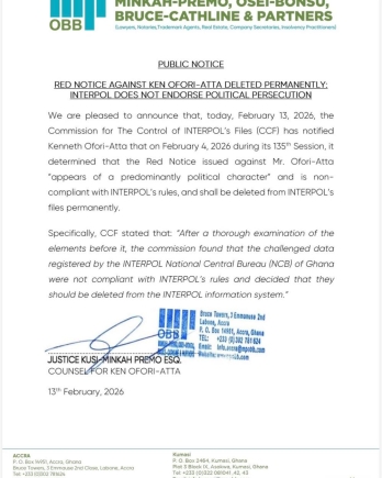 In a public notice issued on Friday night [February 13, 2026], Mr Ofori-Atta's lawyers, Minkah-Premo, Osei-Bonsu, Bruce Kathline and Partners announced that the Commission for The Control of INTERPOL's Files (CCF) has notified Mr Ofori-Atta that on February 4, 2026, during its 135th Session, it determined that the Red Notice issued against him “appears of a predominantly political character" and is non-compliant with INTERPOL's rules, and shall be deleted from INTERPOL's files permanently.