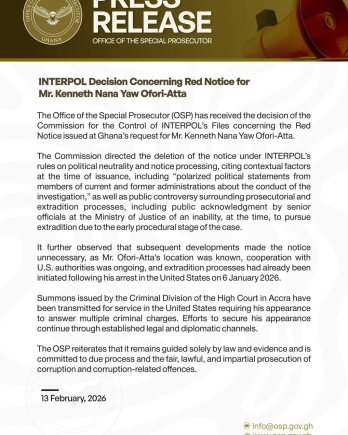 On his part, the Office of the Special Prosecutor (OSP), which applied for the Red Notice in a statement issued also on Friday night, confirming the development, indicated it has received the decision of the Commission for the Control of INTERPOL's Files concerning the Red Notice issued at Ghana's request for Mr. Kenneth Nana Yaw Ofori-Atta.