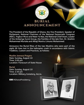 “The President of the Republic of Ghana, the Vice President, Speaker of Parliament, the National Chairman of the National Democratic Congress (NDC), Yogbun Wura and Ndan Ya Naa, the National Chief Imam and Leader of the Ambariya Sunni Group, alongside the families of the deceased, announce the burial rites in accordance with Islamic tradition, customs, and practices,” the committee said.