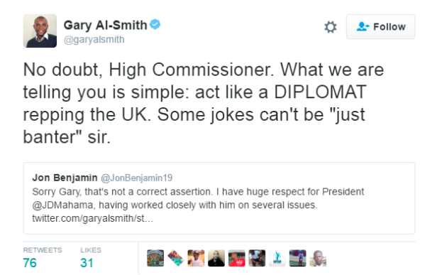 "No doubt, High Commissioner. What we are telling you is simple: act like a DIPLOMAT repping the UK.Some jokes can't be "just banter" sir," Sports Journalist Gary Al Smith tweeted.
