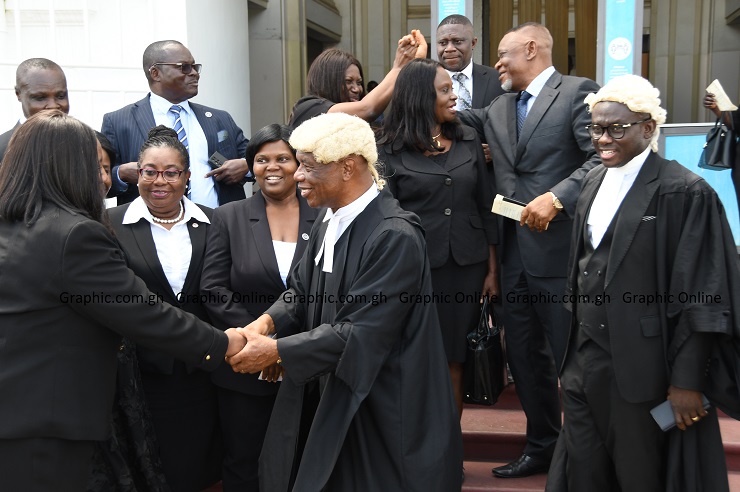 After the valedictory judgment, the Supreme Court building was turned from its usual legal and formal character as an adjudication chamber to a theatre of dancing, thanksgiving, show of love, appreciation and praises for the man who created the popular adage “create, loot and share” in the Woyome saga, an apparent reference to the corruption and decadence that had bedevilled the Ghanaian society.