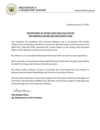President John Dramani Mahama has appointed Ms Justina Nelson as the acting Chief Executive Officer (CEO) of the Minerals Income and Investment Fund (MIIF) following the revocation of the appointment of Edward Nana Yaw Koranteng on Tuesday morning.