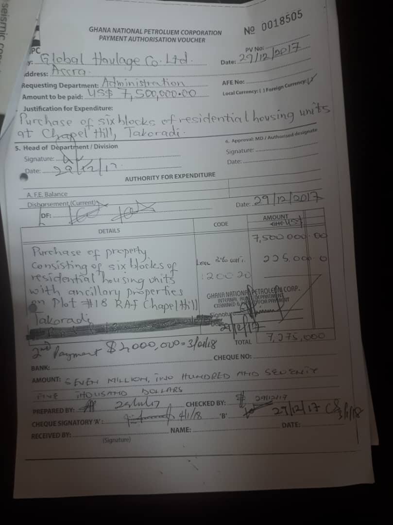 That very day of writing the memo, the GNPC finance officer reportedly wired US$7.5 million into the accounts of Global Haulage, according to the report and on January 3, 2018, a second payment of US$2million was made, bringing the total amount expended on the real estate at US$9.5 million instead of US$7.5.