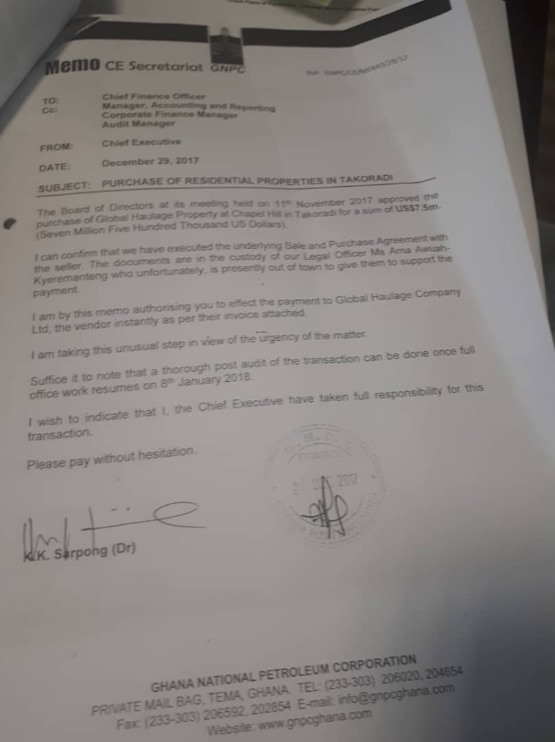 In a memo written to the GNPC finance officer dated December 29, 2017 [copy published below]