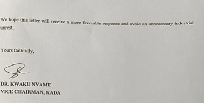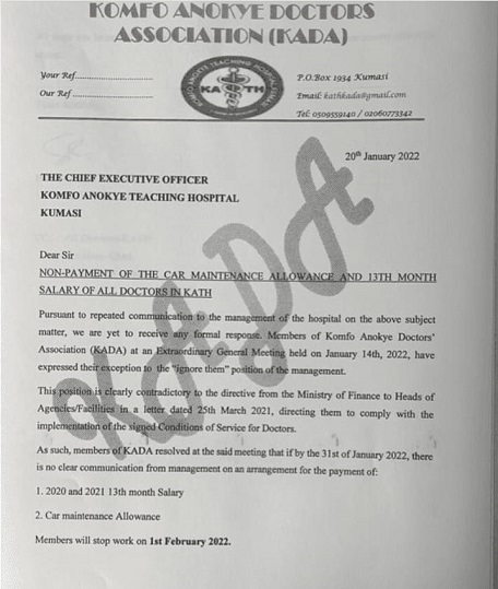 The release signed by the Vice-chairman of KADA, Dr. Kwaku Nyame explained that "Members of KADA resolved the said meeting that if by 31st January 2022, there is no clear communication from management on an arrangement for the payment of 2020 and 2021 13th month salary and car maintenance allowance, members will stop work on 1st February 2022."