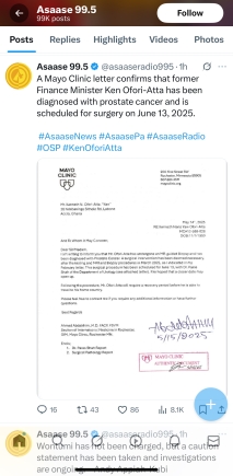 This was contained in a medical letter from the clinic’s Department of Urology, published by Asaase Radio—an outlet founded by his relative and former legal representative, Gabby Asare Otchere-Darko.
