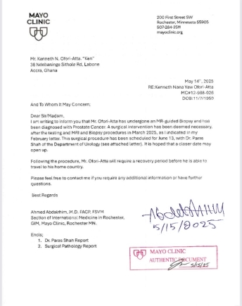 Former Finance Minister Ken Ofori-Atta has been diagnosed with prostate cancer and is expected to undergo surgery on June 13, 2025, at the Mayo Clinic in the United States.
