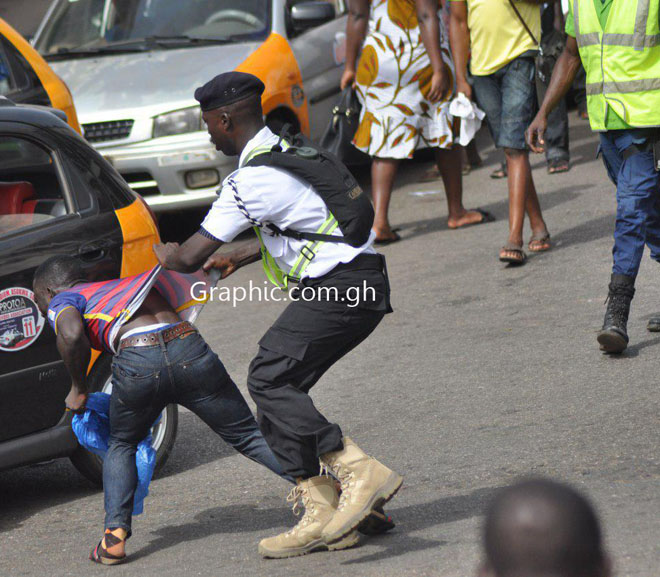 Graphic Online’s Kumasi photographer, Emmanuel Baah on Monday captured the KMA taskforce struggling with one of the traders who had returned to the streets in the central business district of Kumasi after several attempts by the assembly to ensure that no one sells on the roads and pavements after the decongestion exercise.