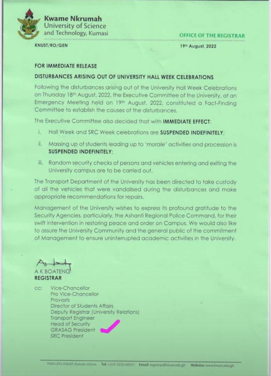 Below is a copy of a statement signed and issued by the KNUST Registrar, A.K. Boateng on the issue