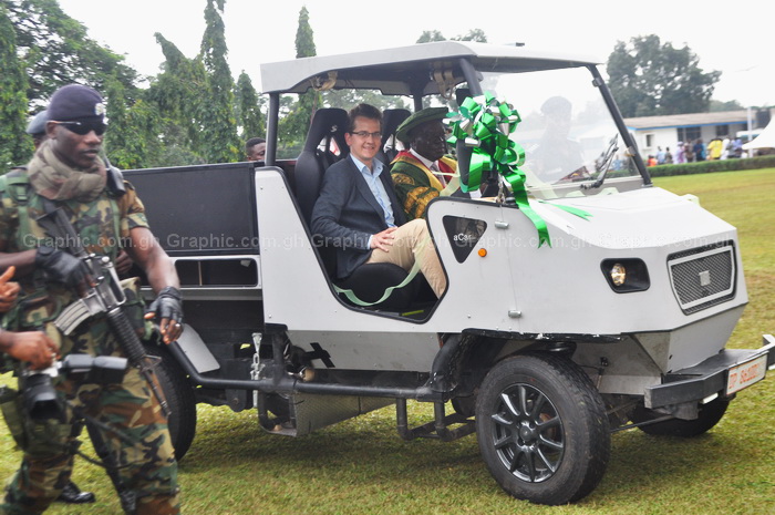 The Asantehene, Otumfuo Osei Tutu II, taking a test drive after he inaugurated the car. With him on the vehicle is Mr Marhu Soctes, one of the project leaders from Germany