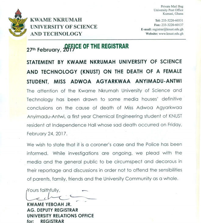 According to the Acting Deputy Registrar in Charge of Public Relations at the KNUST, Mr Kwame Yeboah Jnr, the deceased, Adwoa Agyarkwa Anyimadu-Antwi did not fail any paper as reported in some sections of media.