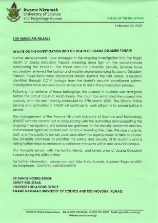 KNUST Management provides update on death of female student on campus and arrest