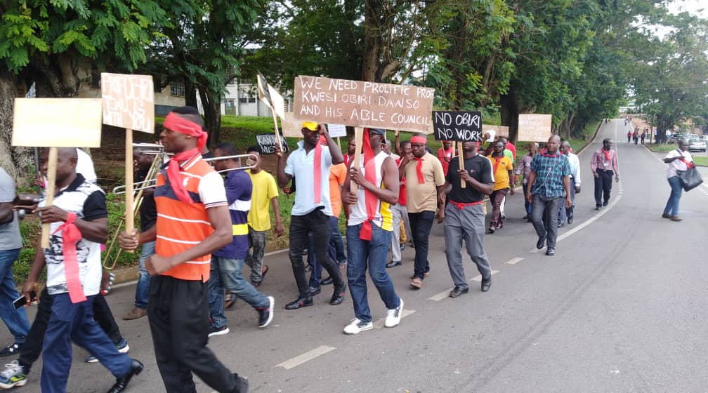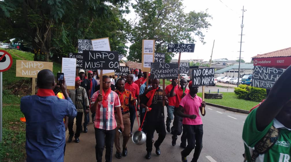 The Teachers and Educational Workers Union (TEWU) of the Kwame Nkrumah University of Science and Technology (KNUST) on Monday went on a procession campus to kick against the dissolution of the University Governing Council.