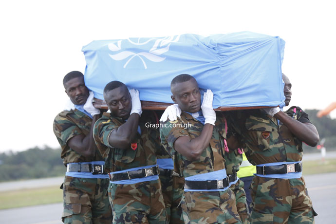 After the casket was taken from the airplane, the UN flag draping it was removed and a Ghanaian flag used to drap it. PICTURES BY EMMANUEL QUAYE AND SAMUEL TEI ADANO