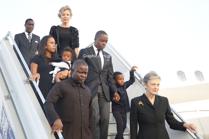 The plane, which carried the casket draped in a UN flag, accompanied by his wife, Nane Maria, children and some UN officials touched down at the Kotoka International Airport in Accra at 17:24 GMT after it left Geneva, Switzerland Monday morning.