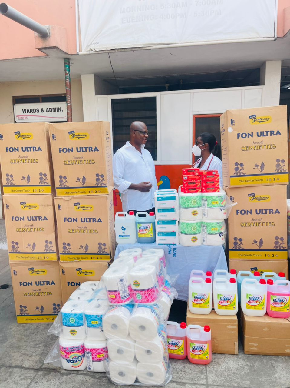 The items included chocolates for all nurses on duty and the children on admission, toiletries, tissues, gallons of hand sanitizers and liquid soaps.