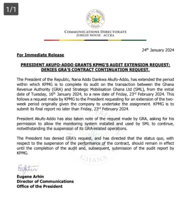 The President of the Republic, Nana Addo Dankwa Akufo-Addo, has extended the period within which KPMG is to complete its audit on the transaction between the Ghana Revenue Authority (GRA) and Strategic Mobilisation Ghana Ltd (SML), from the initial date of Tuesday, 16th January 2024, to a new date of Friday, 23rd February 2024.