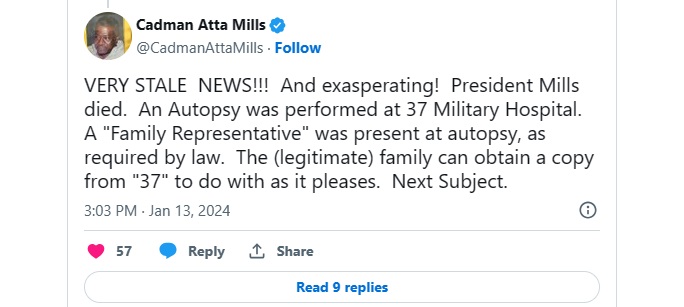 He said he heard Mr Samuel Atta Mills, a brother of late Mills on radio stating that he was given an autopsy report.