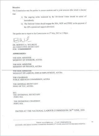 The National Labour Commission (NLC) has directed the Divisional Union of the National Identification Authority (NIA) under the Public Services Workers Union (PSWU) to immediately call off its ongoing strike.