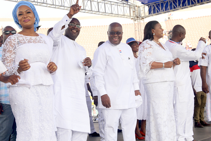 Nana Akufo-Addo (2nd right), President-Elect together with Dr Mahamudu Bawumia (2nd left), Vice President, Mrs Rebecca Akufo-Addo and Mrs Samira Bawumia praising God at the ceremony in Accra. Picture: SAMUEL TEI ADANO