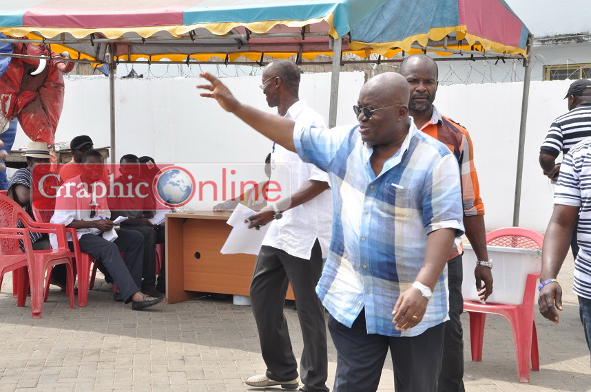 10:15 am - Nana Akufo Addo, the hot favourite and two-time flag bearer cast his ballot at the party's national headquarters at Assylum down.